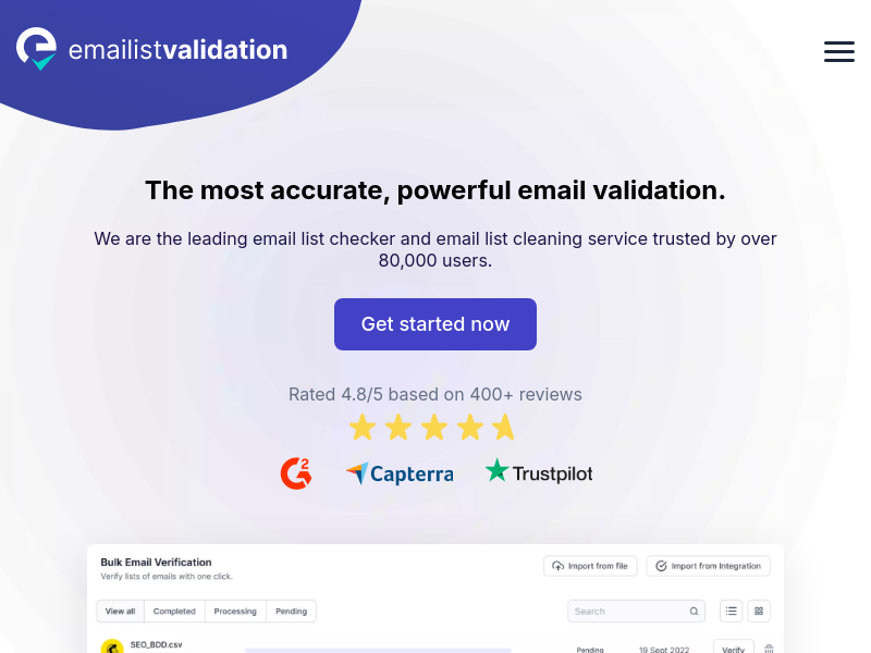 Bulk email verifier Get rid of spam traps bounces and disposable emails Start with 100 FREE email validations Secure accurate bulk email validation
